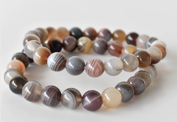 Authentic Botswana Agate: 8mm natural beads with beautiful layered patterns in soft gray, brown, and white tones.